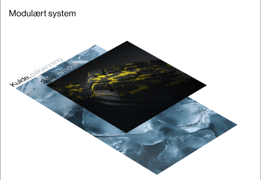 Ved å utvikle et modulært og fleksibelt designsystem er det mulig å oppnå begge deler samtidig; sikre høy visuell kvalitet i all kommunikasjon rundt produktene våre uten å gå på bekostning av volum og frekvens. Gjennom en modulær tilnærming der vi fristiller visuellene for produkt fra visuellene for egenskaper kan vi skape et stort antall unike kombinasjoner og dermed dekke et høyt volum av kommunikasjonsuttak.
